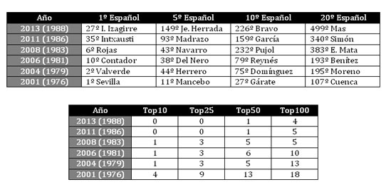 Menos jóvenes españoles brillan. Hace doce años podíamos encontrar 18 españoles entre los 100 mejores sub25 del mundo según el ránking CQ, 4 entre los 10; desde 2010, con Rojas, no hay ningún ciclista nacional en dicho top10. Respecto al nivel medio, el décimo mejor español de menos de 25 años en 2001 era 27º; actualmente, es 226º.