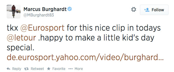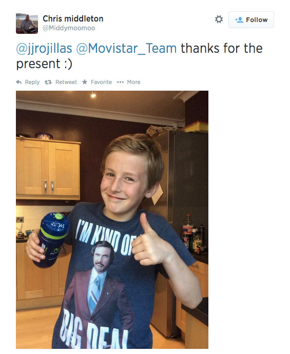 Por cosas como ésta que pretende reflejar el post se diferencia el ciclismo, para bien, del resto de deportes. Todos los tuits son de aficionados felices por la interacción que han podido realizar con sus ídolos y la sensación de haber formado parte del espectáculo; todos han sido retuiteados por los corredores aludidos, satisfechos de haber ilusionado y alegrado a los espectadores. Por cosas como ésta que pretende reflejar el post mola tantísimo el ciclismo.
